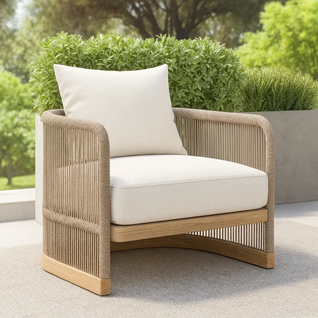 Matériau : Structure en bois massif, accoudoirs en corde tressée en polyester, coussins en tissu polyester avec mousse polyuréthane